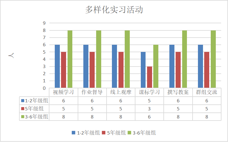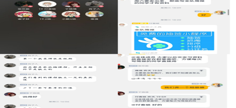 在各位指导教师的引导下,各位实习教师进行着多学科课程的学习,进而了解多学科教学过程的多样性,丰富教学方式及方法,促进教学的有效性。同时各小组成员也积极参与讨论,探讨第一周实习事宜的反馈,讨论线上学习带来的不便以及改进措施,并进行小组内简报分工,力求让每一位实习教师都得到进步。所有的实习教师也都积极参与、主动发言和以实际行动来表达自己的想法,体现出实习教师在思想上的积极进取。