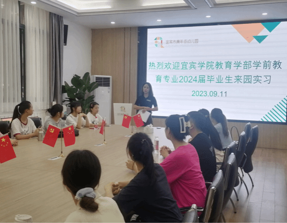 9月11日,bv伟德国际1946教育学部实习指导老师黄丽蓉带队学前教育专业18名员工到宜宾市青年街幼儿园参加实习生见面会。