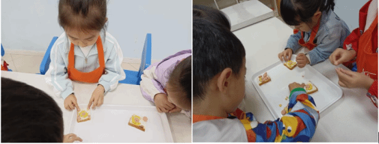 周五上午,大二班学号前半部分的幼儿在上烘焙课,此次烘焙课的内容是制作三明治,夏老师提前准备好需要的食材,向幼儿展示三明治的制作过程。然后让小朋友们开始制作,小朋友们用玉米和火腿肠拼出了一朵花的形状。在制作的过程中他们兴致勃勃,吃到自己的劳动成果后十分开心。