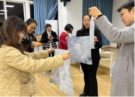 活动第四环节是扎染作品的鉴赏。经过之前一段时间的浸泡,现场展示老师和同学们共同折叠、捆绑的扎染布料成品。作品的完成不仅仅是简单的染色过程,也是制作者的创意、情感的注入。老师们第一次亲身感受了传统手工印染技术在自己的手下诞生出美丽的作品,也给大家分享了自己的创作感受和体会。