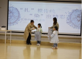 活动第二环节是现场体验扎染制作。学前教育专业的同学们认真指导参加活动的老师和小朋友如何折叠、捆绑布料、选择合适的染色方法,然后将布料放入染桶中静置等待染色。师生们在制作体验过程中相互交流,共同解决问题,现场气氛很热闹也很融洽。