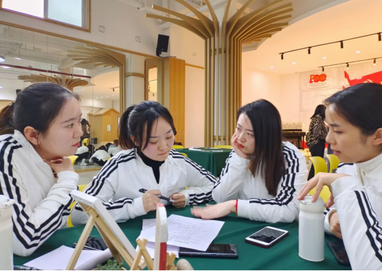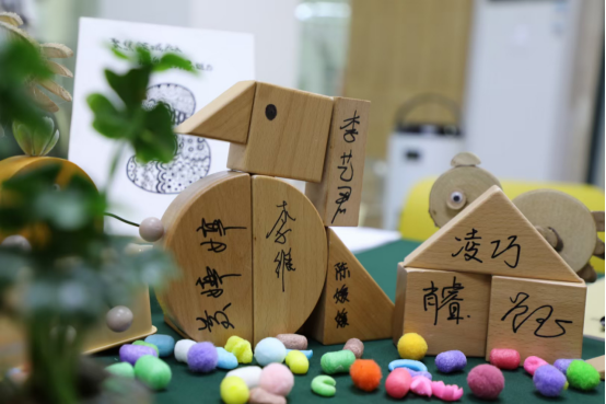 教研活动共分为五个环节,第一个环节是自由分组,共分为4组,每组由2名骨干教师+6名学院路老师构成。第二个环节是“操作小游戏”环节,主持人请老师们利用桌上的松散材料制作成一份小组成员名字的主题小景观。第三个环节是数理游戏,旨在培养幼儿教师的高阶思维能力。