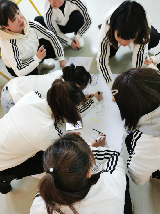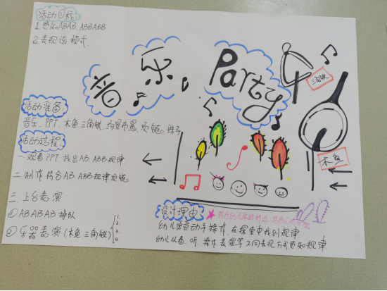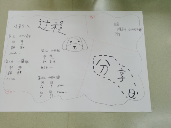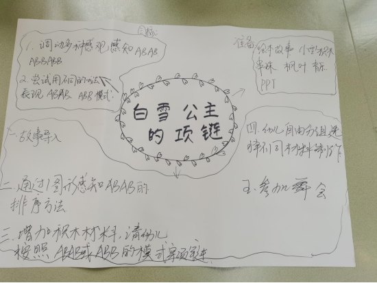 第四个环节“同课异构”,也是此次教研活动的重点。刘巧莉园长提供给每个小组一份共同的活动目标,让各小组进行头脑风暴,构思各自的活动名称、活动准备、活动过程,说明各自的设计理由和设计人员,并将其画在纸上。经过40分钟的“智慧碰撞”,最终,老师们分别展示了“音乐Party”、“小狗分享日”、“白雪公主的项链”、“森林舞会”四个主题的设计。
