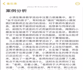 首先由实习生进行幼儿园的案例分享,分享的案例主要包括案例描述、案例分析以及措施三个方面。通过线上进行屏幕共享和口述的方式向其他实习生和实习指导老师展示自己观察到的典型案例。在案例分享结束后,由其他同学进行点评,点评主要是从案例本身进行进一步的分析,提出自己对于该案例的不同意见或措施,让同学们深入思考,自主探索。