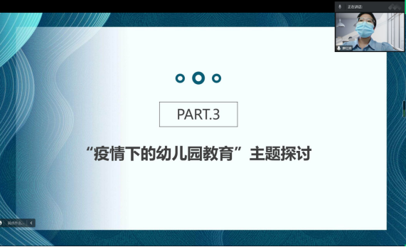 最后,同学们结合当前的特殊情况,以“疫情下的幼儿教育” 为主题展开讨论,分享了不同幼儿园针对疫情开展线上活动的具体做法,以及对疫情下幼儿教育出路的一些思考。与此同时,廖老师对每位同学的分享做出了有针对性的回应,帮助同学们拓展思路,开阔视野。