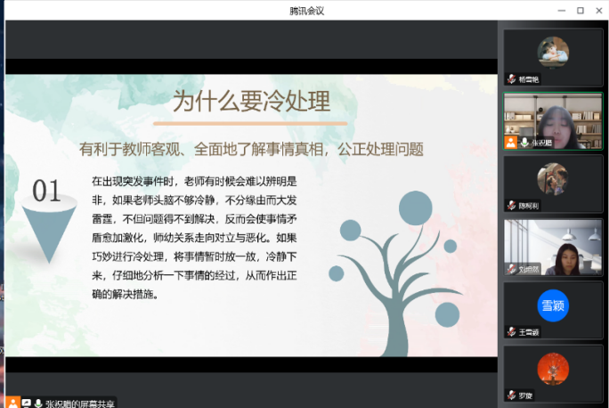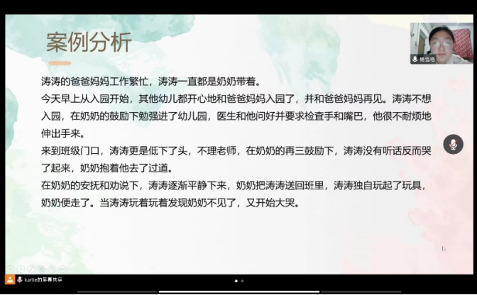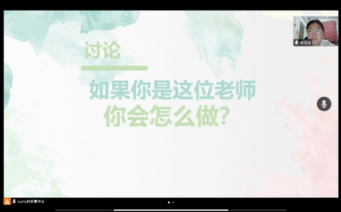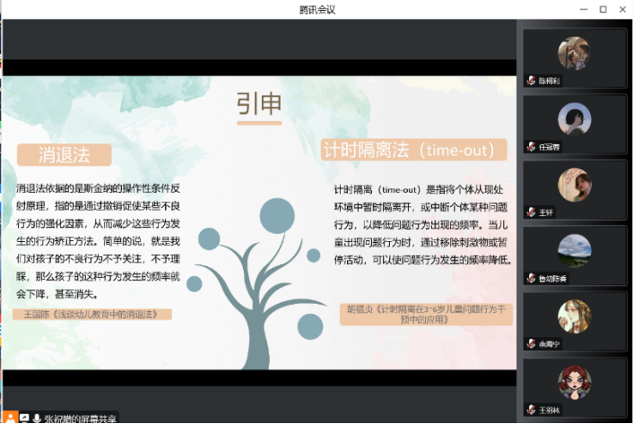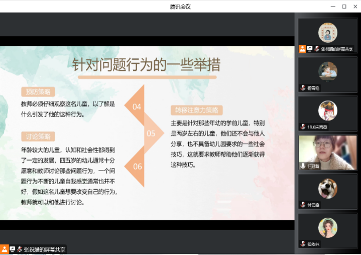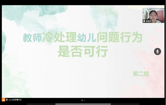 2022年10月14日晚上20:00,bv伟德国际1946教育学部学前教育专业实习小组举行了鲁家园幼儿园实习生线上主题分享会:教师冷处理幼儿问题行为是否可行。实习带队教师刘坦然老师与鲁家园幼儿园陈香老师及18名2019级实习生共同参加了此次会议。本次分享会由第二组成员负责开展。