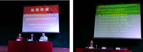 与会老师还观摩了广西师范学院初等教育学院,邹循东经理为老师们做了主题为“凝心聚力促认证,专业成长我责任”的报告,邹经理结合广西师范学院小学教育专业,重点介绍了专业认证的主要方式、准备与工作策略,以及关于认证材料撰写的体会,使与会老师深切感受了他们在师范类专业认证的实际工作中得到的经验讲座后老师就自己困惑的问题与副经理梁宇进行了交流互动收获颇丰
