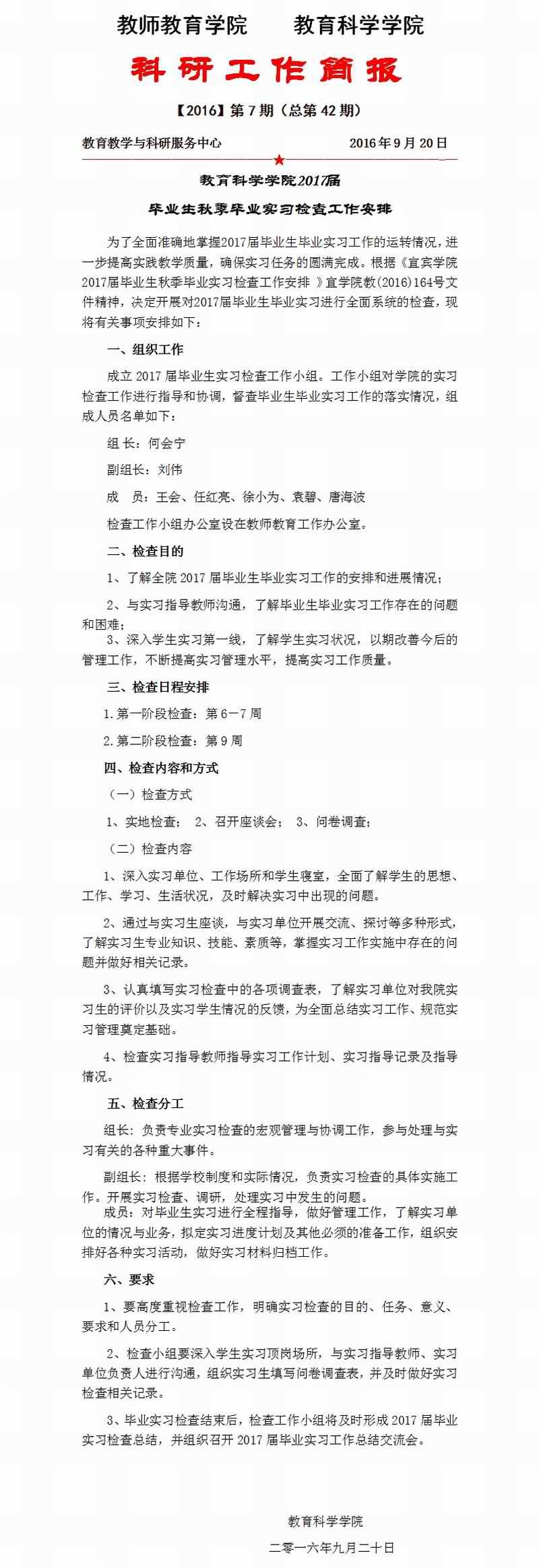 教育科学学院2017届毕业生秋季毕业实习检查工作安排