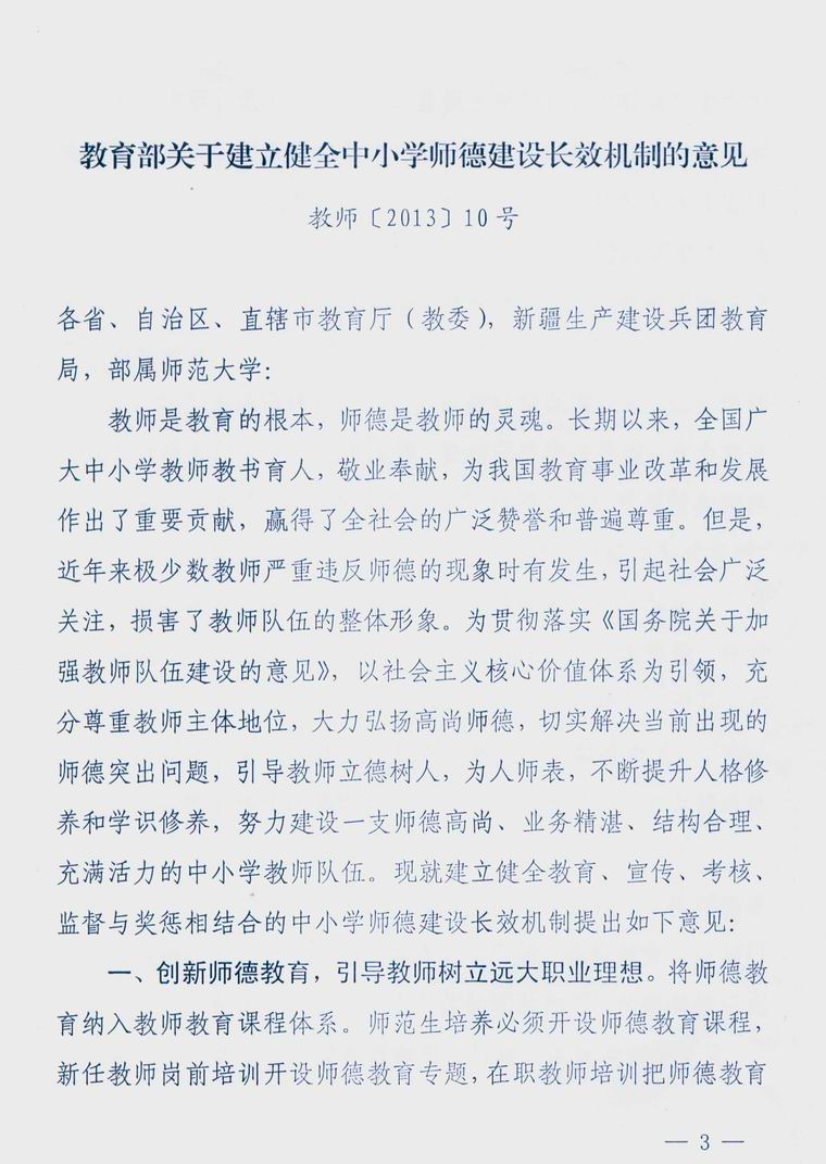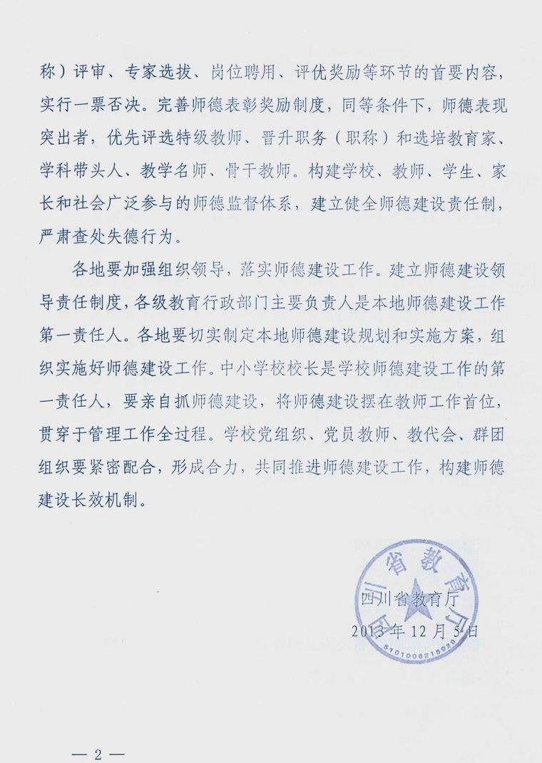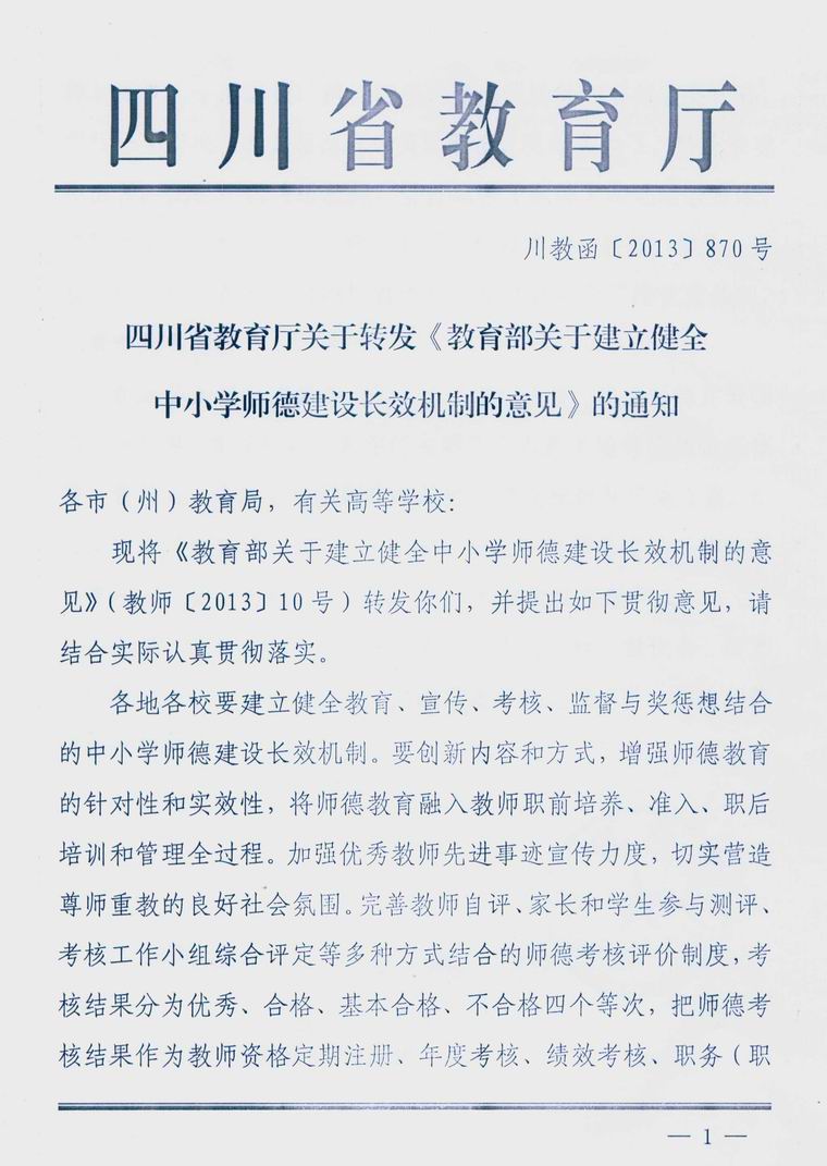 四川省教育厅关于转发《教育部关于建立健全中小学师德建设长效机制的意见》的通知
