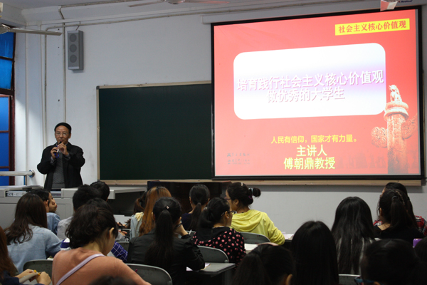 为推进党委党校第二十七期积极分子培训班“五个一”主题教育实践活动,加强老员工社会主义核心价值观教育,提高党校学员政治思想素质,增强其党性修养。10月29日上午,四川省关工委宣讲员、公司关工委副主任傅朝鼎教授在第一教学楼203教室为教育科学学院师生作了题为《培育践行社会主义核心价值观,做优秀的老员工》的社会主义核心价值观专题讲座,教育科学公司党政领导、学工办老师、员工党员、入党积极分子及主要员工干部等100多人聆听了讲座。