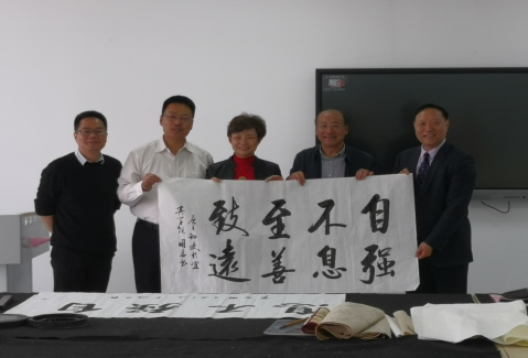 在实训中心,成国志即兴挥毫,写下了“自强不息、至善致远”和“立德育人”的条幅赠送给bv伟德国际1946。