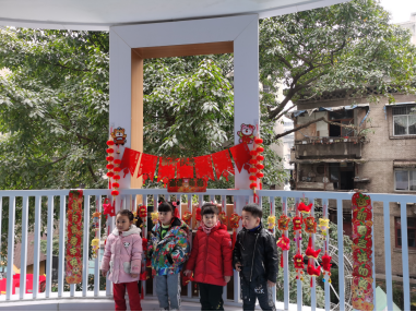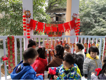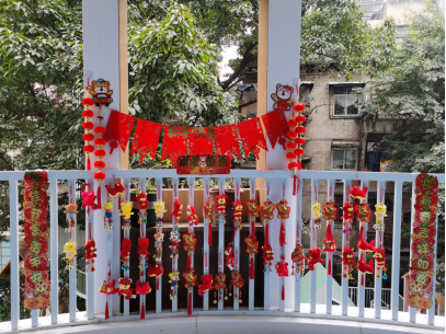 中一班刘老师、唐老师、单阿姨和“陈老师”一起布置走廊的环境,挂上了红灯笼,贴上了喜庆的对联和窗花,请小朋友们挂上可爱的玩偶。