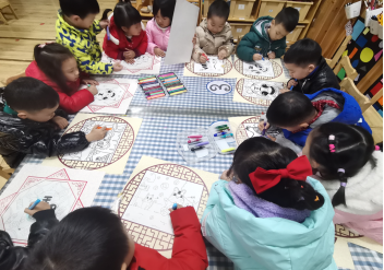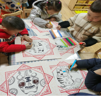 陈老师带着哥哥姐姐提前画好的各种样式的老虎发给每个幼儿一张,请小朋友们涂上自己喜欢的颜色。