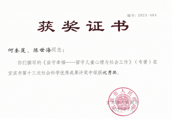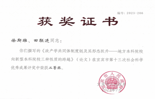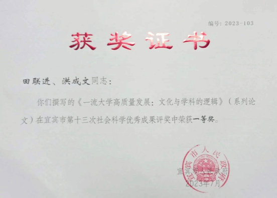 2023年7月,教育学部田联进教授在宜宾市第十三次社会科学优秀成果评奖中荣获一等奖,徐斯雄副教授在宜宾市第十三次社会科学优秀成果评奖中荣获二等奖,何奎莲教授在宜宾市第十三次社会科学优秀成果评奖中荣获优秀奖。