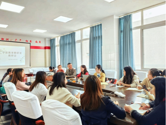 2023年10月25日,学前教育教研活动在博雅楼506召开,参会人员有教育学部副部长杜江、学前教育教研室主任梁运佳及全体专任教师。