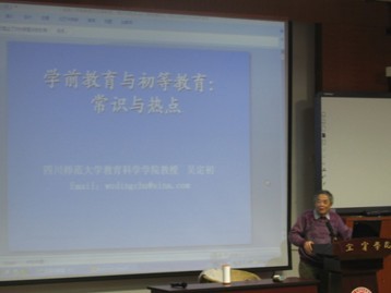 417日上午9点,在硕勋楼A101学术报告厅,bv伟德国际1946小学教育与学前教育专业的师生聆听了吴定初教授题为“学前教育与初等教育:常识与热点”的讲座。吴教授纠正了我们关于学前教育与初等教育的一些认识误区,对国内外学前教育与初等教育的热点和发展趋作了梳理、归纳,并为本科生毕业论文选题提出了宝贵的建议。吴教授在2个多小时的讲述中没有休息,一直站在讲台上,用洪亮的声音传达着丰富的学术信息。在互动环节中,师生们非常珍惜与吴老师交流的机会,提问接连不断。一位bv伟德国际1946的退休教师自始至终听完了吴教授的讲座,与吴老师进行了亲切的交流。吴定初教授年过花甲,这位退休老师步入古稀,两位老师精神矍铄,令师生们羡慕。他们对学术的热爱与追求也让大家肃然起敬。