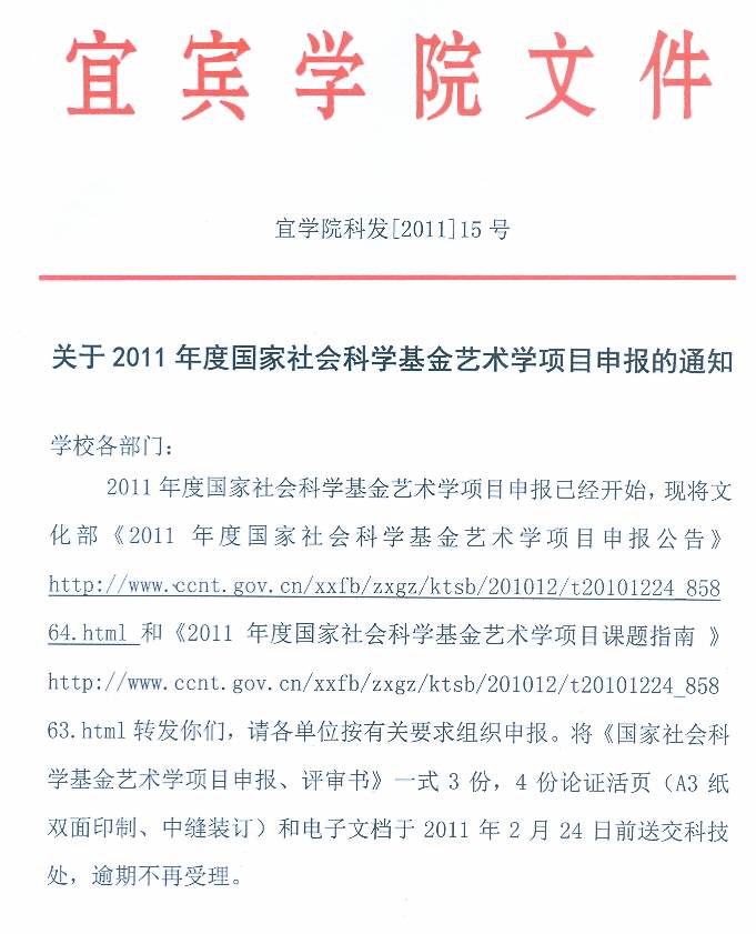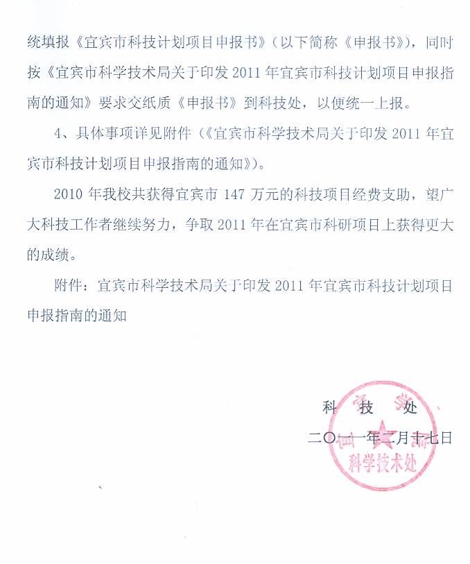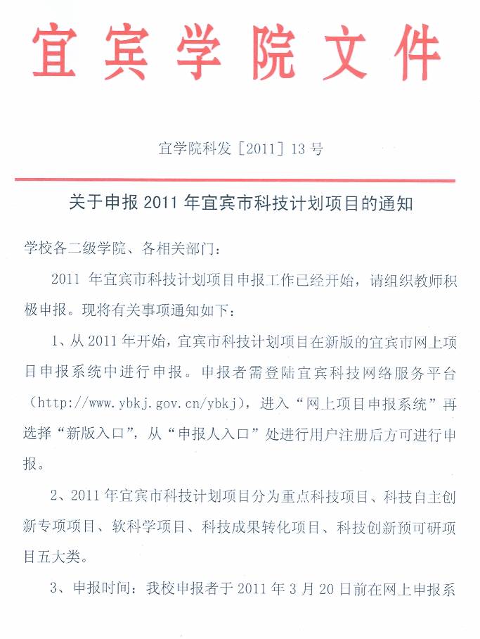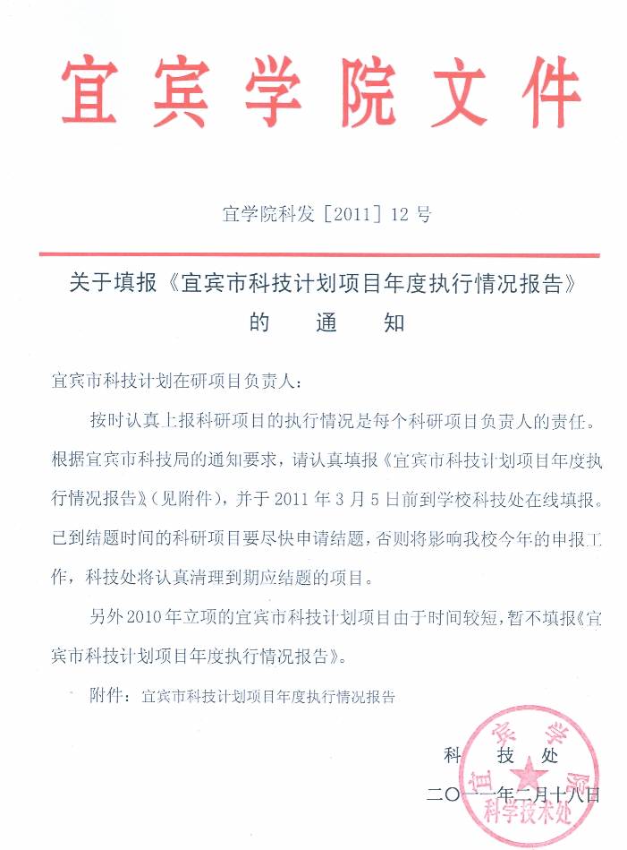 1、关于填报《宜宾市科技计划项目年度执行情况报告》;2、关于《申报2011年宜宾市科技计划项目》;