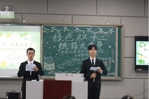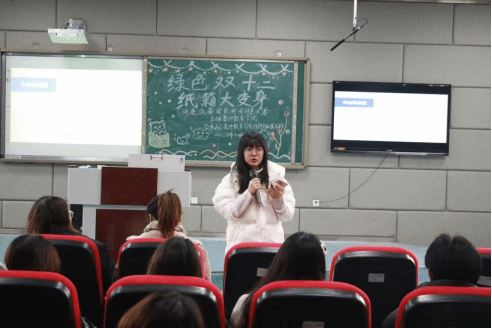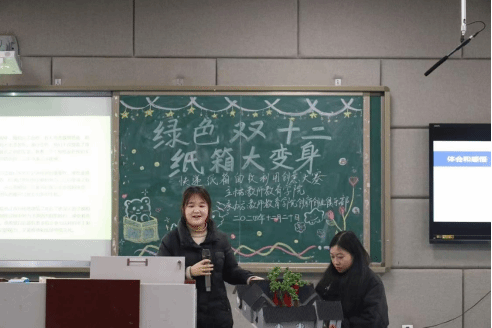 官美灵作为评委代表在活动中发表讲话。她在发言中强调了环保意识的重要性,并号召全体同学以此次大赛为契机,深度参与到纸箱回收利用行动中,将环保理念融入日常生活与学习实践,用实际行动为建设绿色校园、推动环保事业发展贡献力量。