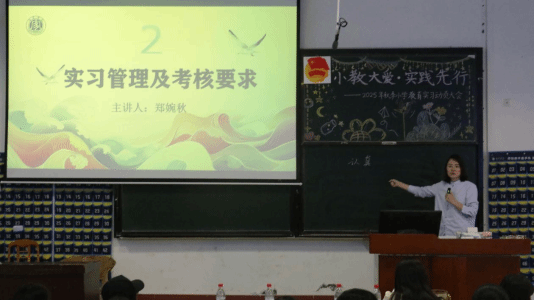 郑婉秋围绕实习安排及考核要求进行详细的解读,她指出此次实习涵盖课程教学观摩、课程设计与授课、班级管理等多个方面,同学们要严格遵守实习学校的规章制度,认真完成每一项任务。同时,她提醒同学们在此次实习活动中要注重反思与总结,为未来的教育工作积累宝贵的经验。