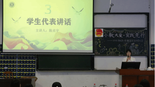 实习生代表陈贞宇在发言中表达了对实习的期待与决心。她表示,全体实习生将以积极的心态迎接实习挑战,严格要求自己,虚心学习,努力提升教学技能和班级管理能力,不负学院和老师的期望,圆满完成实习任务。