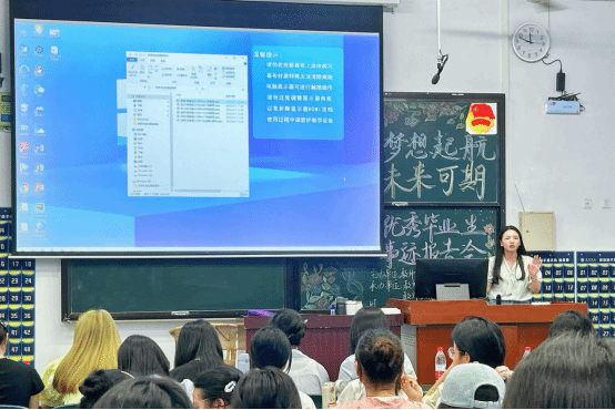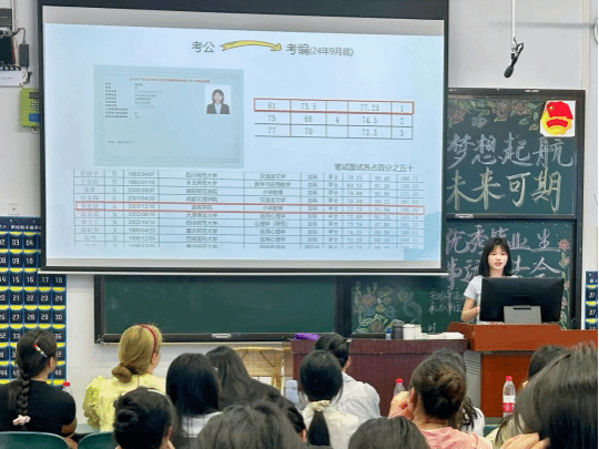 会上,杨诗莲、谢晓丽、王春梅、李明遥、彭玉莲、黄庭庭六位优秀毕业生作为分享人,分别从考研究生、公务员、教师编的目标选择、备考策略、时间管理等多个维度,向在场的同学们传授了宝贵的经验。其中,作为考教师编成功的代表,黄庭庭系统介绍了事业单位招考信息的获取渠道,并创新性地提出了“逐字稿打磨+场景模拟”的面试准备方法,以提升面试竞争力。整场报告会通过一个个成功案例的生动呈现,为在校生们勾勒出了一条清晰的就业发展路径,激发了他们的奋斗热情和职业规划意识。