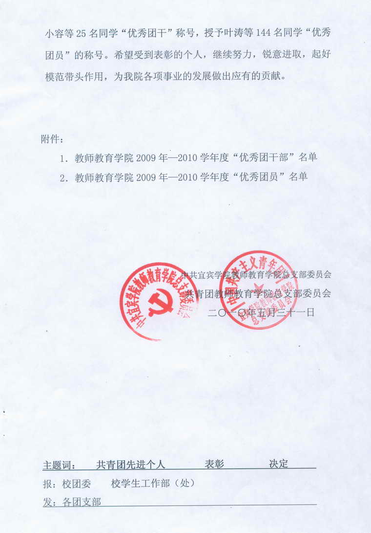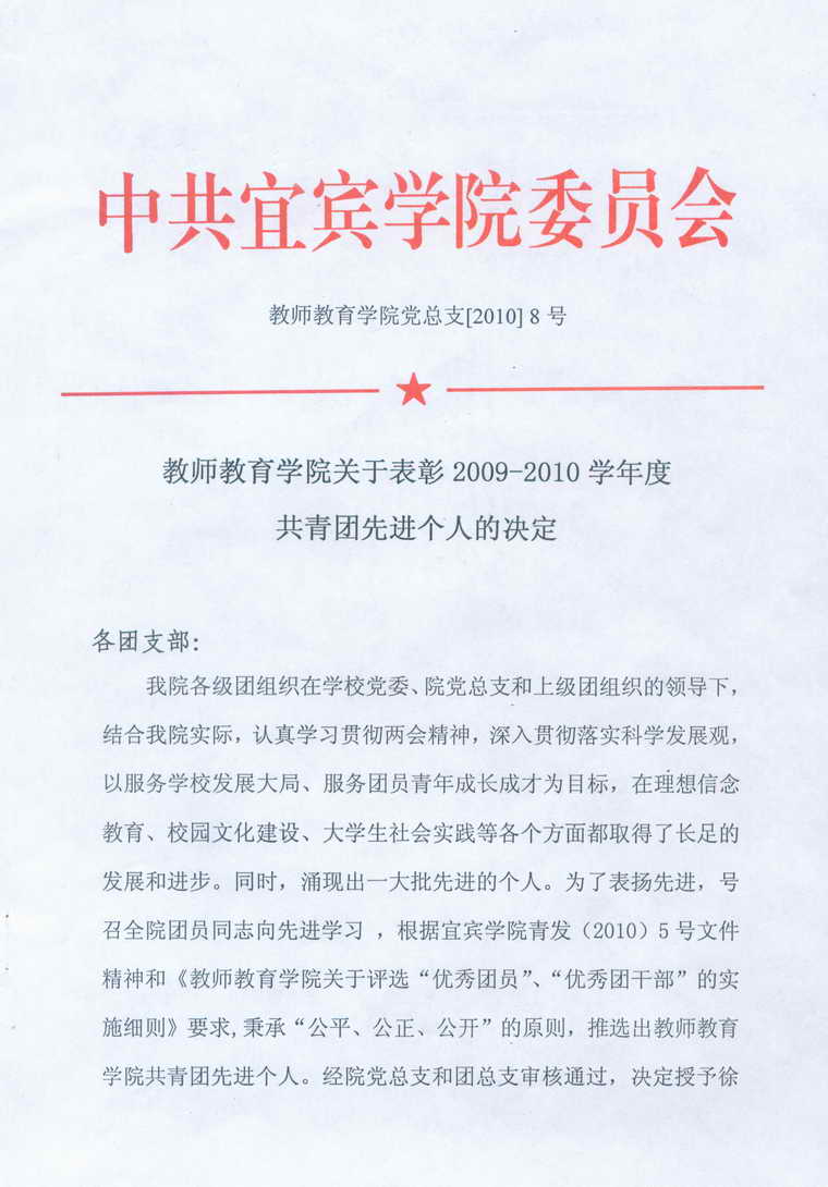 bv伟德国际1946关于表彰2009-2010学年度共青团先进个人的决定