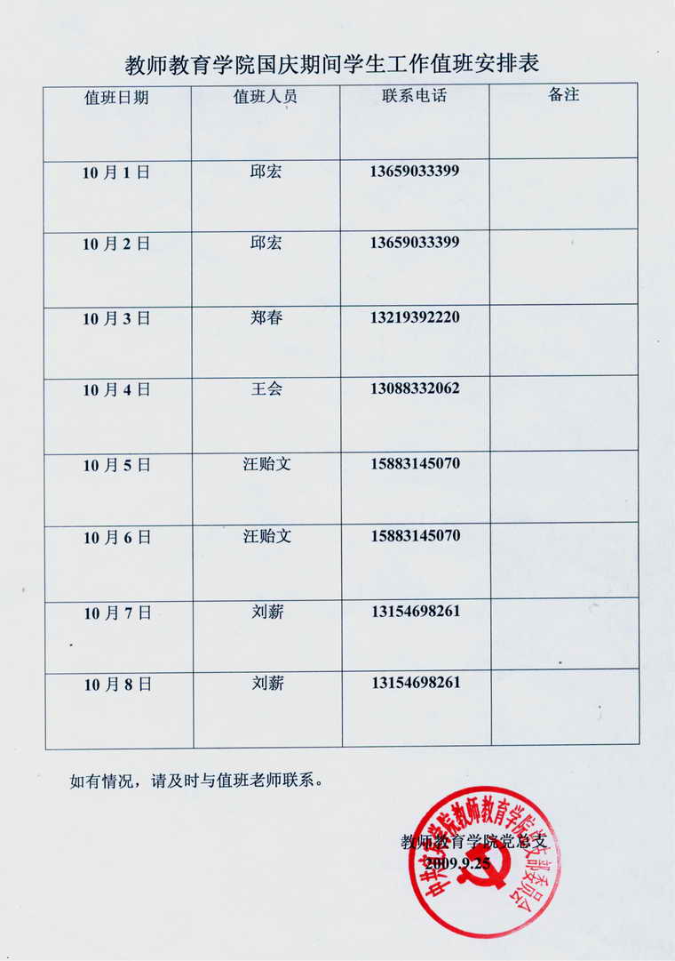 bv伟德国际1946国庆期间员工工作值班安排表