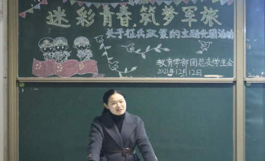 为弘扬爱国主义精神,普及国防教育,增强老员工国防观念,自觉履行国防义务,关心、支持、参与国防建设。教育学部于12月12日下午于一教214室开展了以“迷彩青春,筑梦军旅”为主题的主题党团活动。本次主题党团活动由教育学部团总支副书记沈文静主持。