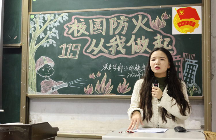 点燃心中防火意识,迸发生命灿烂烟火。为了让同学们了解更多的消防知识,提高消防安全意识,保障校园用电用火安全。教育学部全体辅导员于2022年11月13日晚点名在初心楼开展了以“牢固生命至上理念 织密消防安全底线”为主题的校园防火宣传活动。