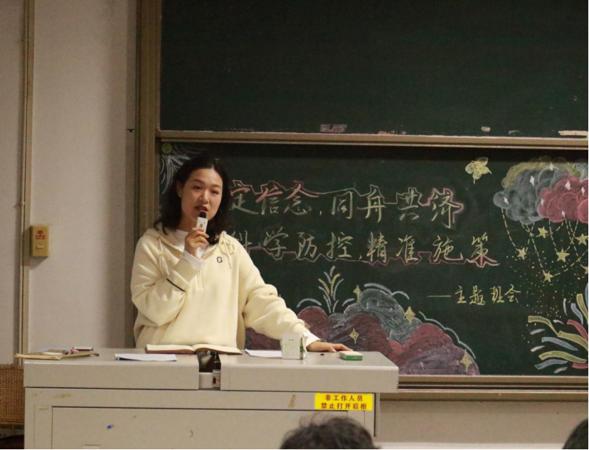 为了让员工们对新政策有更深层次的理解,李伟让各班班委朗读最新疫情防控条例,并强调“口罩是最有力的防控力量”,同时也告知同学们提防新冠病毒的同时也不要过度敏感,辨清普通感冒与新冠疫情感染病症;沈文静也敦促员工们要严格按照规范条例抵御疫情,切不可“摆烂”态度对待疫情防控要求;李佳欣也就近期进出校门的注意事项做出了进一步讲解,要求同学们要积极配合学校对新冠疫情的相关措施。