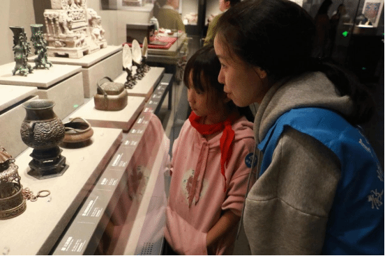 活动中,志愿者们分小组向游客们详细介绍了各种博物馆展品的背景、意义以及制作工艺等,重点帮助少年儿童更好地理解和欣赏文物展品。值得一提的是,志愿者们还特别设计了小游戏吸引小朋友们,这种寓教于乐的方式,不仅激发了他们对传统文化的兴趣,也让他们进一步学习了解文物展品背后代表的文化知识。