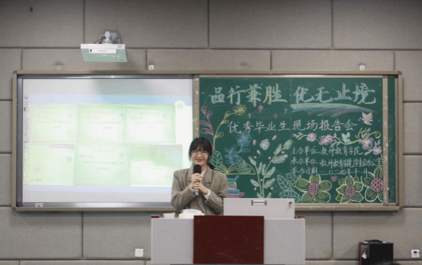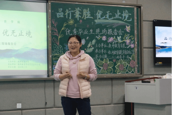 最后,辅导员杨云云对7位优秀毕业生所呈现的精彩报告给予了极高的赞誉,她强调,毕业生们不仅展现了非凡的才华与成就,更体现了不忘初心、勇于担当、敢于创新的精神风貌。杨云云寄语毕业生们,在新的人生阶段要继续秉持这份热情与坚持,书写更加灿烂的篇章。同时,她也深情勉励在校学子,要以这些优秀毕业生为镜,勤勉学习,奋发向上,为实现个人梦想与社会进步贡献自己的青春力量。