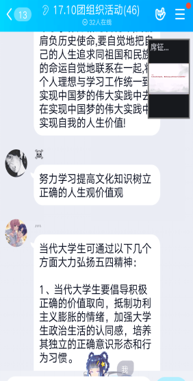 此次线上主题团日活动,主要是对习近平总书记“五四”寄语精神进行深入地学习和讨论。通过团支书讲解PPT、各团员在线观看相关学习视频、同学们参与相关话题讨论等形式来具体开展本次主题团日活动。同学们受到习近平总书记“青年一代有理想、有本领、有担当,国家就有前途,民族就有希望”寄语的极大鼓动。