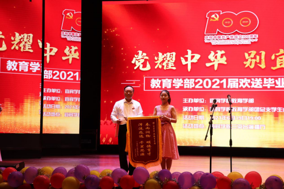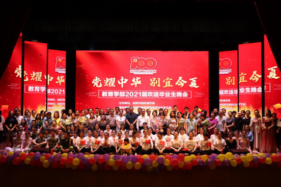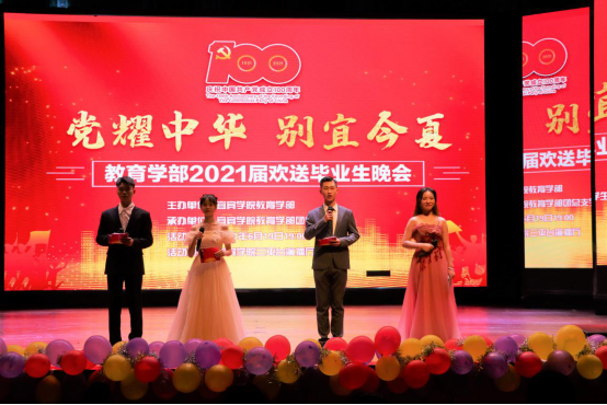 奋斗百年路,启航新征程,为热烈庆祝中国共产党成立100周年,2021年6月19日19:00,教育学部在三平台演播厅举行了“党耀中华,别宜今夏”2021届欢送毕业生晚会。教育学部党总支书记、部长何会宁,教育学部党总支副书记刘薪,教育学部副部长刘伟、教育学部正处级组织员蒋泓洁,以及教育学部全体教职工和2021届毕业生参加了此次活动。