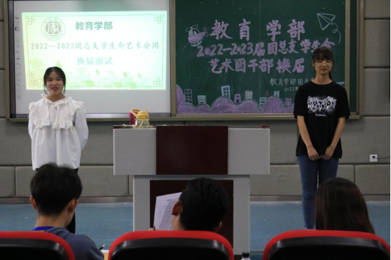 在此之前,教育学部团总支员工会艺术团分别于5月25日下午和6月2日12:30 在博雅楼B201举行2022-2023届团总支员工会艺术分团干部换届面试和主席团换届面试。选举产生了新一届主席团成员和各部门负责人。
