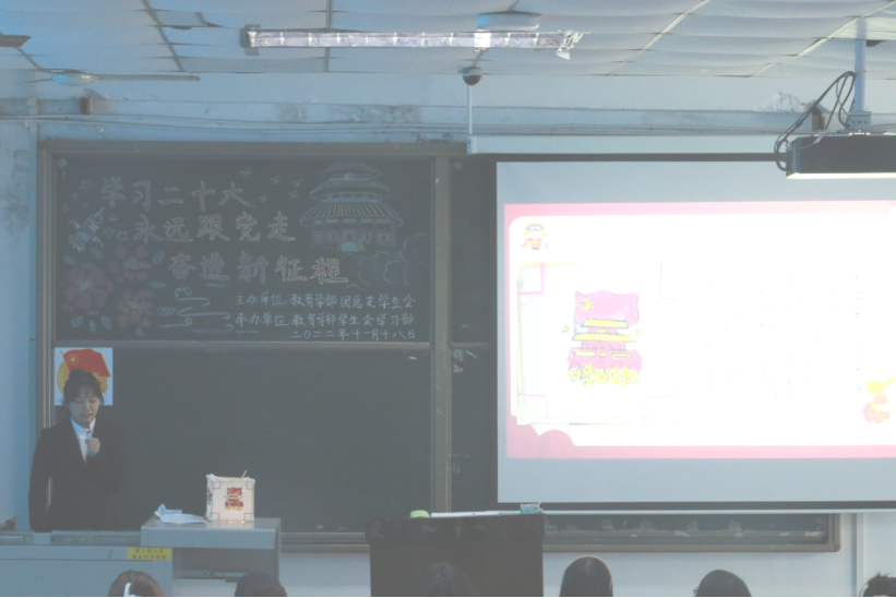 最后经过评选,6份作品脱颖而出并代表学部参加校级决赛,分别是21.4陈映春,叶莉《万家灯火》;22.6杨苁凌《喜迎二十大,共筑中国梦》;21.2周然,周悦,黄慧《红船精神永流传》;20.8张先妹,宋菲,何婷《跟党走》;20.2李心怡《庆祝二十大》;20.1梁婷《党在我心中》。