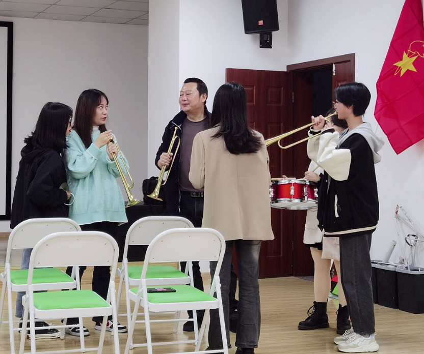 牟洁随后为全体成员介绍鼓号队基本构成和相关的理论知识,并为队员分发乐器。他为队员现场演示各种不同类别鼓号的吹奏方法,和各类型鼓使用的注意事项。