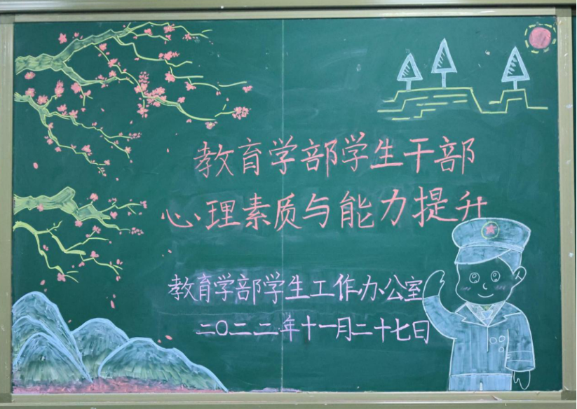 习近平总书记在中央党校青年干部培训班开班仪式上,对青年干部做出重要指示、明确要求,青年干部身处伟大时代,肩负着继承与发展党和国家事业的历史使命。为提高干部心理素质和能力,11月27日晚19:00,教育学部团总支、员工工作办公室于博雅楼B201室开展了员工干部心理素质与能力提升培训。本次活动由教育学部团总支书记唐辉主讲,教育学部团总支员工会艺术分团干部、2020级、2021级和2022级各班主要班委参加了此次培训。