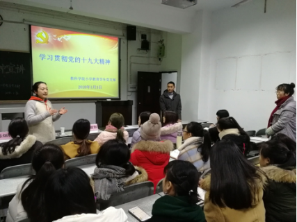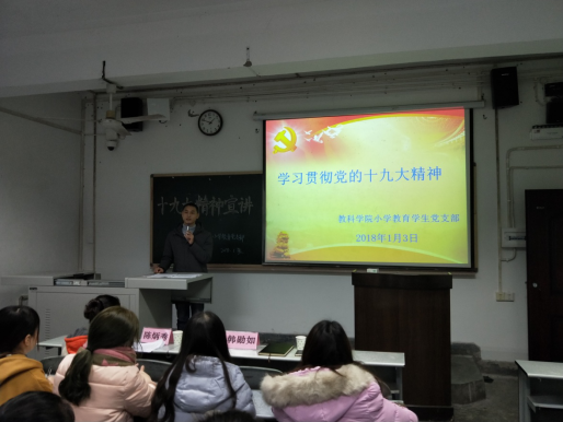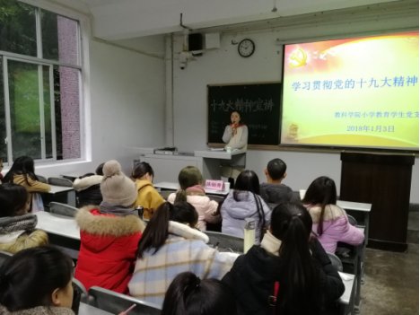 为更好地学习贯彻党的十九大精神,2018年1月3日下午,共青团宜宾市委宣讲小分队党的十九大精神宣讲座谈会在公司举行。团市委办公室主任陈炳秀、组宣部部长韩勋如分别进行了十九大精神宣讲。公司小学教育专业员工党支部党员、发展对象以及入党积极分子共计70余人聆听了宣讲。