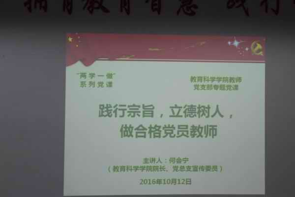 为深入进行“两学一做”学习教育主题“坚持根本宗旨,勇于担当作为”学习研讨,教育科学学院教师党支部于2016年10月12日15时在本院会议室(一教楼204室)开展了“践行宗旨,立德树人,做合格党员教师”的专题党课学习活动。专题党课由教育科学公司党总支宣传委员、经理何会宁同志主讲,教育科学学院教师党支部全体教职工党员认真听取了专题党课。