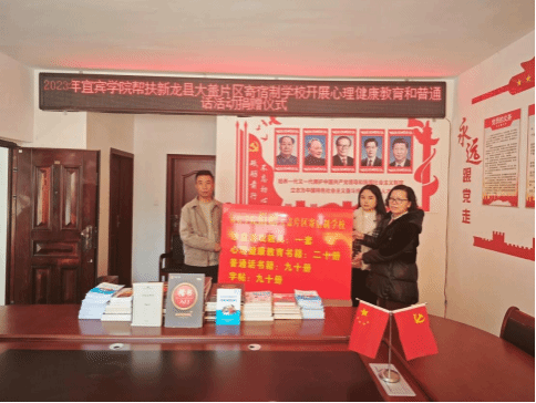 10月17日,心理育人中心和语委办向新龙县大盖片区寄宿制学校捐赠心理健康书籍、沙盘、普通话训练手册及字帖等物品,希望以此提高学校教师的心理健康教育专业技能,提升当地师生的普通话水平与规范汉字的使用意识。捐赠仪式结束后,心理育人中心、语委办与学校教师开展了集中座谈,掌握学校师生心理健康以及普通话使用的情况,了解学校师生心理健康教育与普通话水平提升的需求。