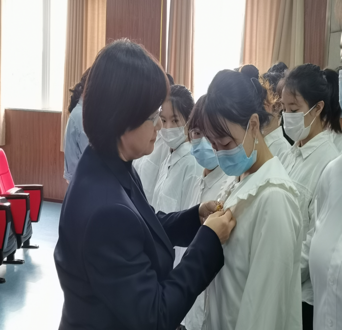 仪式首先由蒋泓洁主任为24名中共预备党员佩戴党徽,并在王勤的带领下进行了入党宣誓仪式。面对鲜红的党旗,现场响起阵阵激昂的誓言,同志们用心发出对党忠诚且永不叛党的决心。