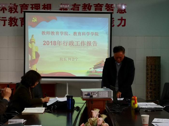 首先,教育科学学院经理何会宁同志向大会做2018年行政工作报告,全面总结了2018年的成绩和收获,同时提出了存在的问题和面对问题应采取的积极措施;对2019年教育科学学院的工作提出了设想并且做出了总体部署。