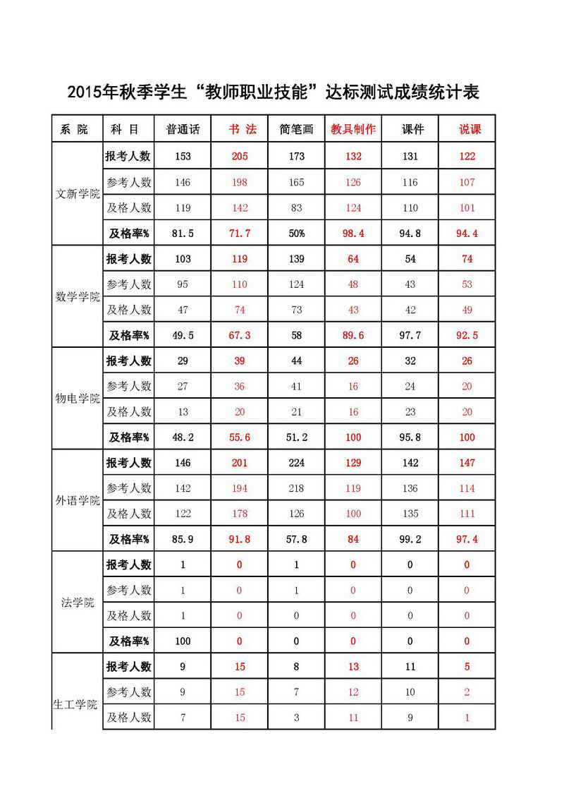 2015年秋季“教师职业技能”达标测试工作顺利结束。本次共有4798人次报名,4264人次参加考试,3290人次合格,合格率为77.15%。六项技能测试的具体情况见附件。