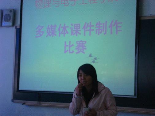 物理与电子工程学院于2010年11月3日下午4:00开始,在三教楼405教室隆重举行了多媒体课件制作比赛。本次参赛选手共有10名,是各班经过初赛后推选出来的优秀选手。
