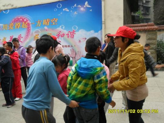 中午时分,志愿者们带着他们自己制作的贴画、剪纸以及糖果、铅笔等小礼物来到了培智学校。此次义务活动主要是采取上课的形式进行。每个志愿者都分到了各个班对培智学校的同学们进行一对一的辅导。志愿者们带着他们折纸,教他们辨图识字,和他们一起唱歌。丰富多彩的辅导内容让各位同学脸上洋溢起开心的笑容。志愿者们还在课间和各位同学们一起大跳《兔子舞》,玩起了各种游戏。操场上欢声笑语一片,好不热闹。
