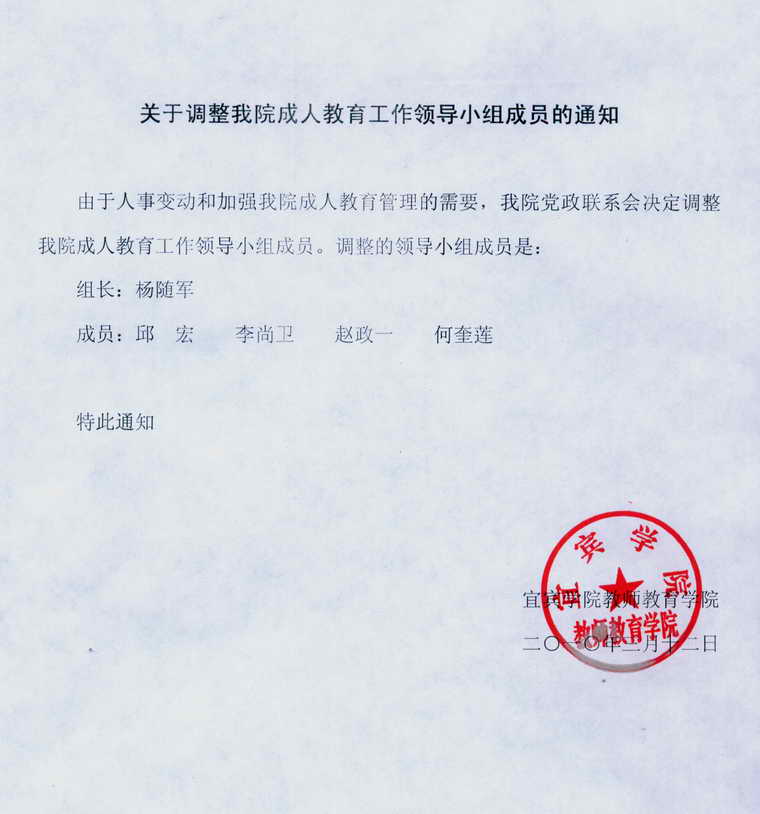 关于调整公司成人教育工作领导小组成员的通知