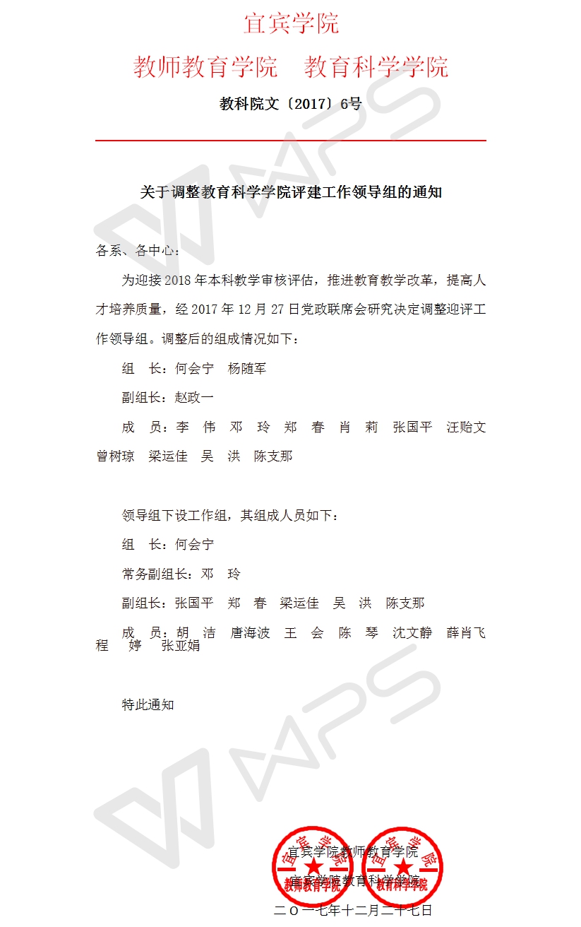 关于调整教育科学学院评建工作领导组的通知