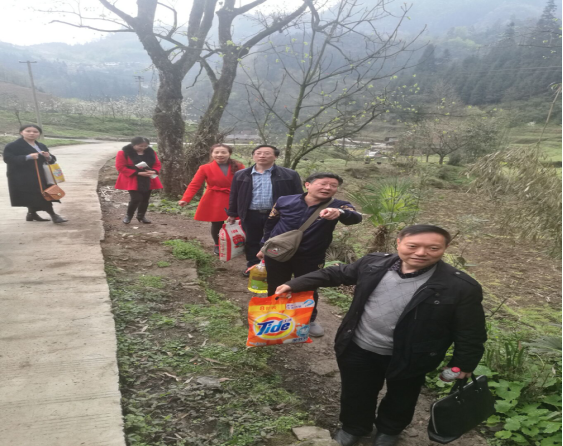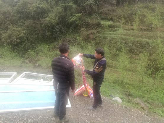 告别老陶,我们又前往何崇书家,为他带去大家的问候。我们同样给他送去了油和米、洗衣粉,还给他的孩子买了学习用具和一些零食。杨书记还专门送去了大半新的门窗和椅子,助他进一步改善生活环境。