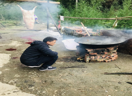 上午10:30我们到何崇书家时看到一头猪刚开膛,另一头还躺在地上等着刨猪毛呢。何崇书和几位乡亲正在忙碌的工作中,为让教职工能早点拿到猪肉,我们一行人立马投入战斗,烧水的烧水,洗桌凳的洗桌凳,摆案板的摆案板,不一会工夫就进入了整猪切分环节。吃过简单的午饭我们又指挥着师傅分割,盘算着如何切分才能做到尽可能的平均。经过近两个小时的奋战,42袋猪肉终于分装完毕。在现场几个乡亲的协助下,我们把猪肉艰难地运下山,装上车,购猪任务算是圆满完成!何崇书从何经理、杨书记手中接过全院教职工筹集的9300元钱和油、米、洗衣粉、牛奶脸上溢满喜悦,嘴里不住地说着感激的话。他发自内心的欣喜感染着现场的每一个人,大家帮忙分肉很累但是心里觉得很开心,帮助人是一种美德,也是责任和使命,能够帮助更多的人通过劳动脱贫致富也不由自主地洋溢着一片阳光!最记得何崇书的母亲看到我们去激动的说不出话来,老人眼中有泪,嘴角颤抖,临走前抓着我的手说老师谢谢你们,谢谢!一句简单的谢谢包含了老人的千言万语,再累再辛苦大家都觉得值得了。